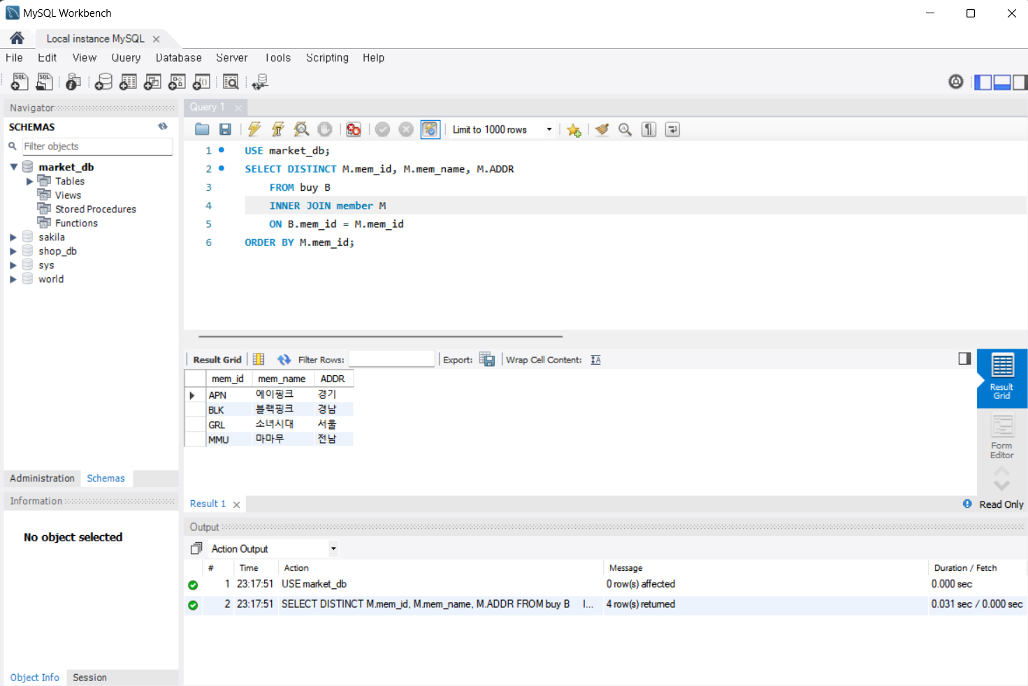 내부 조인이 양쪽 테이블 모두에 있는 내용만 조회된다는 특성을 사용해서 '우리 온라인 마켓을 이용해서 한번이라도 물건을 구매한 기록이 있는 회원들을 검색' 하는 실습이었습니다.