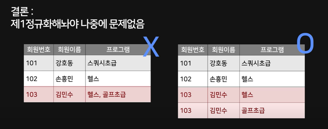- 1NF: 도메인이 원자값이어야 한다. 예를 들어 취미 어트리뷰트에 등산, 축구, 야구,,, 이렇게 여러 값이 들어갈 수 없다.
