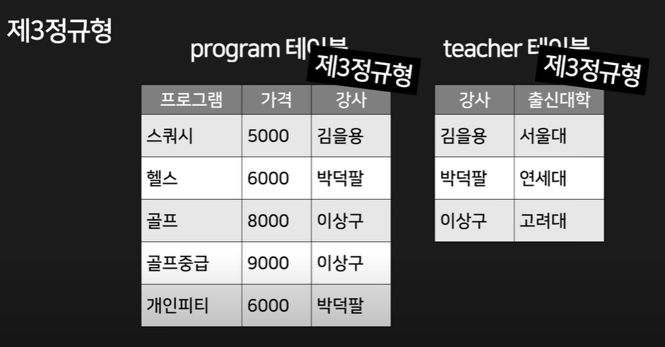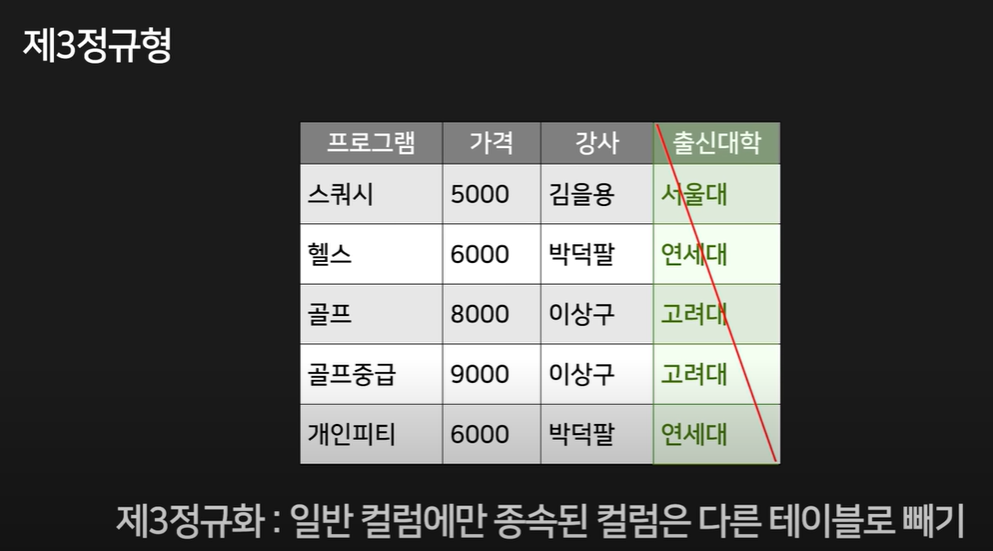 - 3NF: 이행적 함수 종속을 제거해야 한다. 일반 칼럼에만 종속되어 있는 잔챙이 컬럼 제거.
