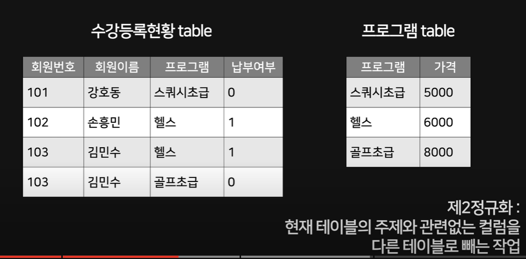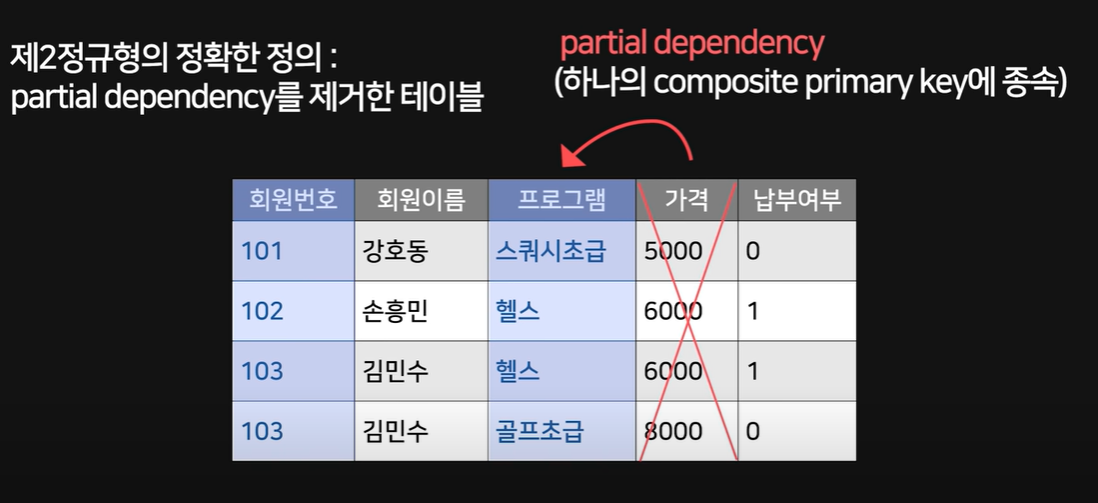 - 2NF: 부분함수 종속을 제거해야 한다. 현재 테이블의 주제와 관련없는 칼럼 다른 테이블로 빼는 작업. composite primary key(두 애트리뷰트를 합쳐서 프라이머리 키를 만듦)