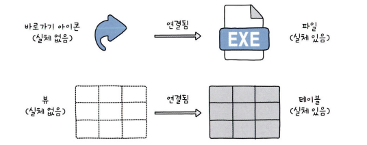 뷰를 한마디로 표현하면 '가상의 테이블'이라고 할 수 있다. 뷰의 실체는 SELECT 문으로 구성되어 있다.