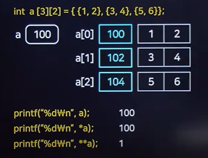 printf("%d\n", *a); // *a는 2차원 배열 1행의 대표 주소를 가리킨다