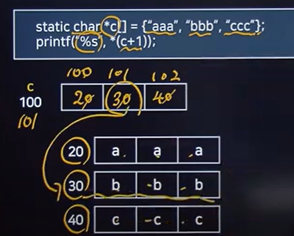 static char *c[] = {"aaa", "bbb", "ccc"}; // 여기서 static은 큰 의미는 없음, 메모리상 어느 위치에 aaa, bbb, ccc가 저장이 될 것이고, 각 주소값을 원소로 가지는 배열이 c이다.