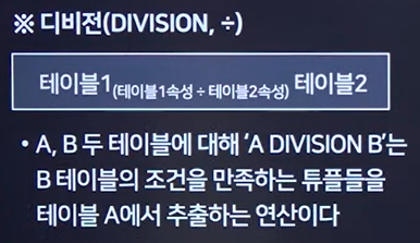 DIVISION: A,B 두 테이블에 대해 'A DIVISION B'는 B테이블의 조건을 만족하는 튜플들을 테이블 A에서 추출하는 연산이다