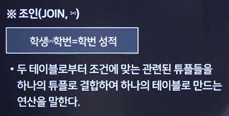 JOIN : 두 테이블로부터 조건에 맞는 관련된 튜플들을 하나의 튜플로 결합하여 하나의 테이블로 만드는 연산