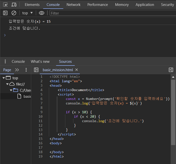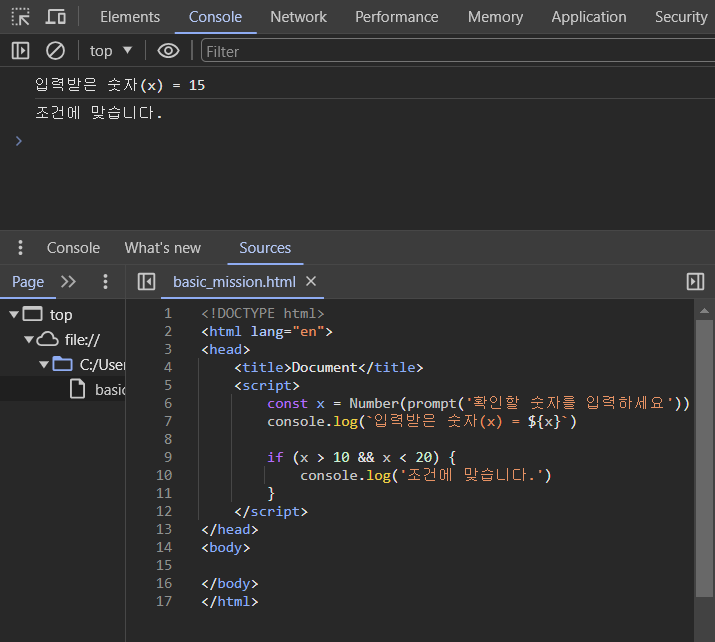 풀이: 10 초과 20 미만이라는 조건을 동시에 만족시켜야 하므로 논리곱 연산자(&&)를 사용한다.