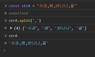 풀이: 문자열 strA의 원본 내용이 바뀌지 않았으므로 split() 메소드는 비파괴적 처리이다.
