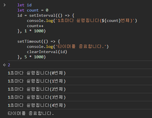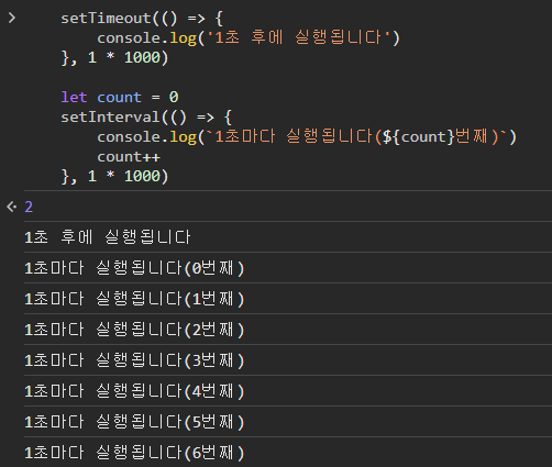 코드를 실행하면 1초 후에 setTimeout() 함수의 콜백 함수가 실행되고, 1초마다 setInterval() 함수의 콜백 함수가 실행되는 것을 볼 수 있다. 1초는 1000 밀리 초 이므로 1 * 1000 을 해서 1초를 나타낸다.