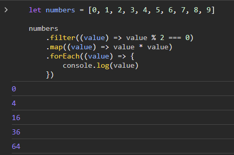 filter() 메소드는 배열을 리턴하므로 map() 메소드를 적용할 수 있고, map() 메소드도 배열을 리턴하므로 forEach() 메소드를 적용할 수 있다. 이렇게 메소드가 리턴하는 값을 기반으로 해서 함수를 줄줄이 사용하는 것을 메소드 체이닝이라고 한다.