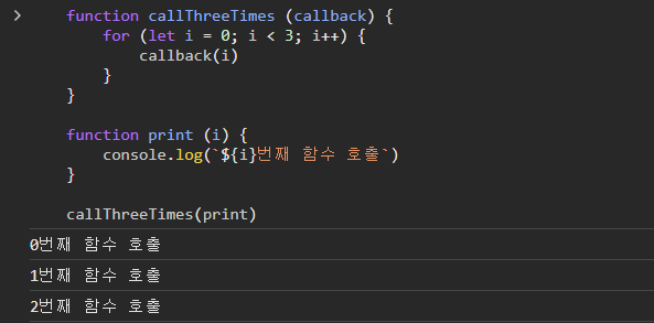 callThreeTimes() 함수는 함수를 매개변수로 받아 해당 함수를 3번 호출한다. callThreeTimes() 함수의 callback 매개변수에 print() 함수를 전달했다. 그리고 callThreeTimes() 함수 내부에서는 callback(i) 형태로 함수를 호출하고 있다. 따라서 매개변수로 전달했던 print() 함수가 print(0), print(1), print(2)로 차례차례 호출되어 실행결과와 같은 결과를 낸다.
