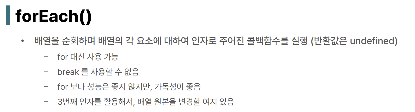 콜백 함수를 활용하는 가장 기본적인 함수는 forEach() 메소드이다. forEach() 메소드는 배열이 갖고 있는 함수(메소드)로써 단순하게 배열 내부의 요소를 사용해서 콜백 함수를 호출한다.