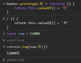 풀이: num은 기본 자료형이므로 메소드가 추가되지 않는다. num과 같은 기본 자료형은 new Number() 키워드를 통해 적절한 객체를 생성해주거나, 대응되는 객체 자료형의 프로토타입(prototype)에 메소드를 추가해야한다.