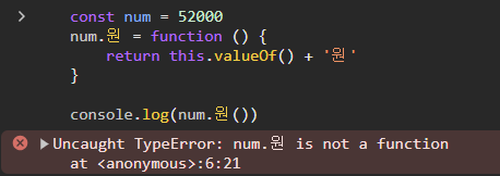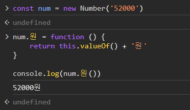 풀이: num은 기본 자료형이므로 메소드가 추가되지 않는다. num과 같은 기본 자료형은 new Number() 키워드를 통해 적절한 객체를 생성해주거나, 대응되는 객체 자료형의 프로토타입(prototype)에 메소드를 추가해야한다.