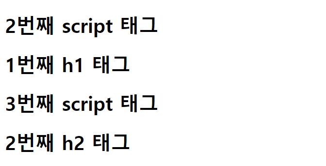 화면에 문자열들이 나타나는데, body 태그가 생성되기 이전에 head 태그 안의 script 태그에서 body 태그를 조작하던 부분(<h1>1번째 script 태그</h1>를 출력하는 부분)은 화면에 출력되지 않았다. 정리하면 기본적으로 head 태그 내부에 script 태그를 배치하면 body 태그에 있는 문서 객체에 접근할 수 없다.