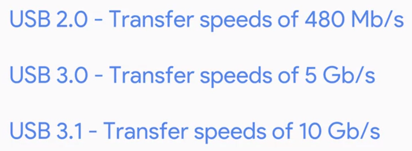 The ports are easy to differentiate. In general, USB 2.0 are black and USB 3.0 are blue and 3.1 ports are teal. This may change depending on manufacturers. There are lots of types of USB connectors, and you can read about all of them in the supplemental reading under this paragraph. The most recent one is the type C connector which is meant to replace many peripheral connections. It's quickly becoming a universal standard for display and data transfer.