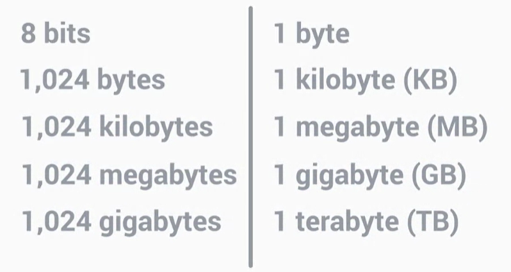 Before we get into computer storage, we need to fill in some gaps. I'm referring to things like gigabytes, bits, etc. But we actually haven't talked at all about what those metrics mean. As you might have guessed, these terms refer to data sizes. The smallest unit of a data storage is a bit. A bit can store one binary digit, so it can store a one or zero. The next largest unit of storage is called a byte, which is comprised of 8 bits. A single byte can hold a letter, number or symbol. The next largest unit is refer to as kibibyte, but we typically use the term kilobyte. A kilobyte is made up of 1,024 bytes. If you're curious why 1 kilobyte refers to as 1,024 bytes and not 1,000 bytes.