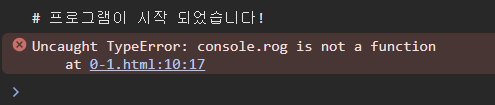 하지만 console.rog() 줄을 읽는 순간 rog라는 식별자가 없어서 undefined인데, 이를 함수 호출 형태로 사용하니 "console.rog is not a function" 이라는 오류를 출력하는 것이다.