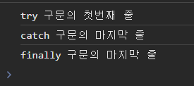 try 구문에서 예외가 발생하고 catch 구문이 실행된다. try 구문에서 예외가 발생하든 안하든 무조건 finally 구문은 실행되므로 위와 같은 결과를 볼 수 있다.