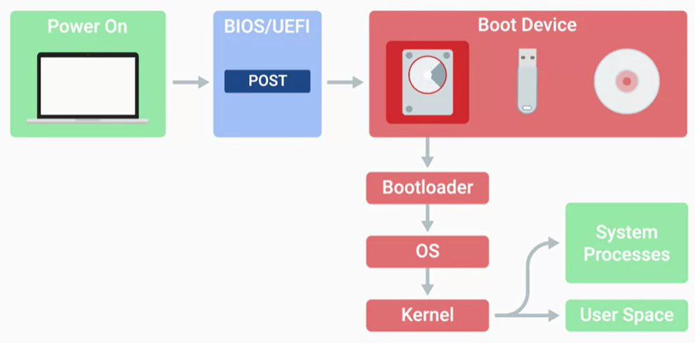 - First, the computer is powered on. Remember what we learned about the BIOS/UEFI in earlier videos? The BIOS/UEFI is a low-level software that initializes our computer's hardware to make sure everything is good to go.