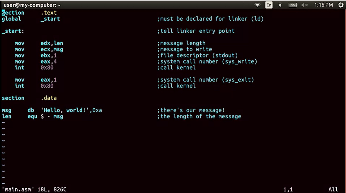 Remember that in the 1950s, computer scientists use punch cards to store programs. These punch cards represented bits that the CPU would read and then perform a series of instructions based on what the program was. But storing programs on punch cards was a long and tedious task. The programs had to be kept on stacks and stacks of punch cards. Computer scientists needed a better way to send instructions to a machine, but how? Eventually, a language was invented called Assembly language, that allowed computer scientists to use human readable instructions, assembled into code that the machines could understand. Instead of generating binary code, computer scientists could program using machine instructions, it is like this, take integer from register one, take integer from register two, add integer from register one and register two and output to register four. This example makes it look like a human can read it, but don't be fooled(사실은 읽을 수 없습니다). Let's take an example of saying something simple like, hello world, in Assembly language. It looks pretty robotic.