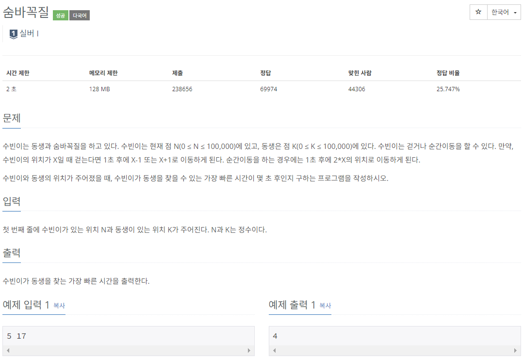 수빈이는 동생과 숨바꼭질을 하고 있다. 수빈이는 현재 점 N(0 ≤ N ≤ 100,000)에 있고, 동생은 점 K(0 ≤ K ≤ 100,000)에 있다. 수빈이는 걷거나 순간이동을 할 수 있다. 만약, 수빈이의 위치가 X일