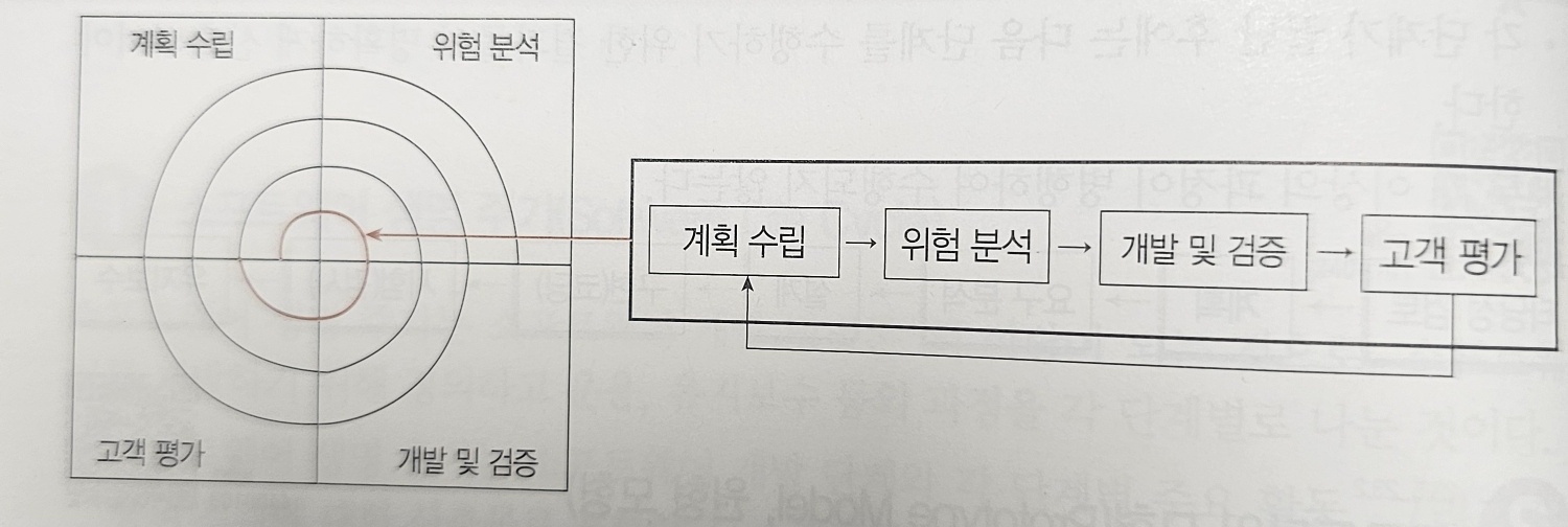 - 나선을 따라 돌듯이 여러 번의 소프트웨어 개발 과정을 거쳐 점진적으로 완벽한 최종 소프트웨어를 개발하는 것으로, 점진적 모형이라고도 한다.