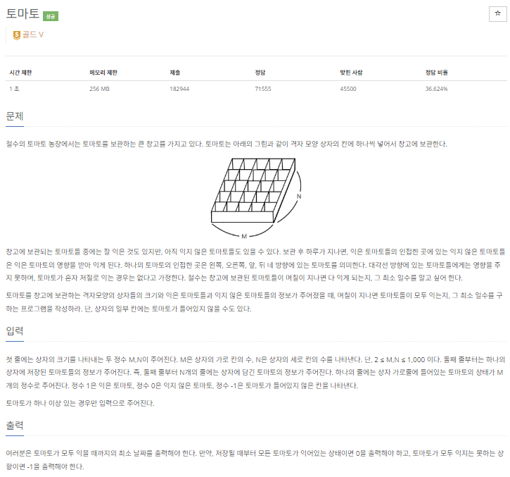 0은 익지 않은 토마토, 1은 익은 토마토, -1은 빈칸을 의미한다.