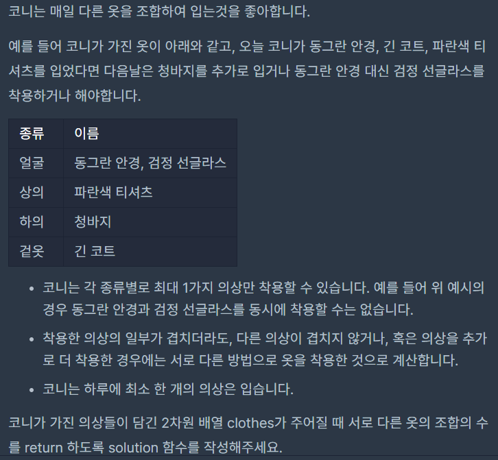 의상의 종류를 key로 하는 딕셔너리를 만드는 것이 첫번째 포인트이다.