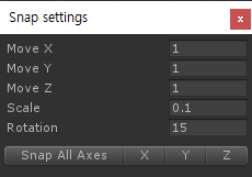 Edit -> Snap Settings 에서 단위 스내핑에 사용할 단위 거리를 지정할 수 있습니다.