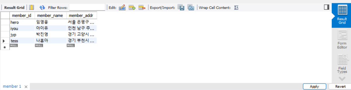 MySQL Workbench 창의 중앙에 Result Grid 창이 나타난다. 아직은 모두 NULL로 표시되어 있는데 member_id, member_name, member_addr 항목의 NULL 부분을 클릭해서 데이터를 생성한다. 여기까지 완료했다면 apply를 클릭한다.