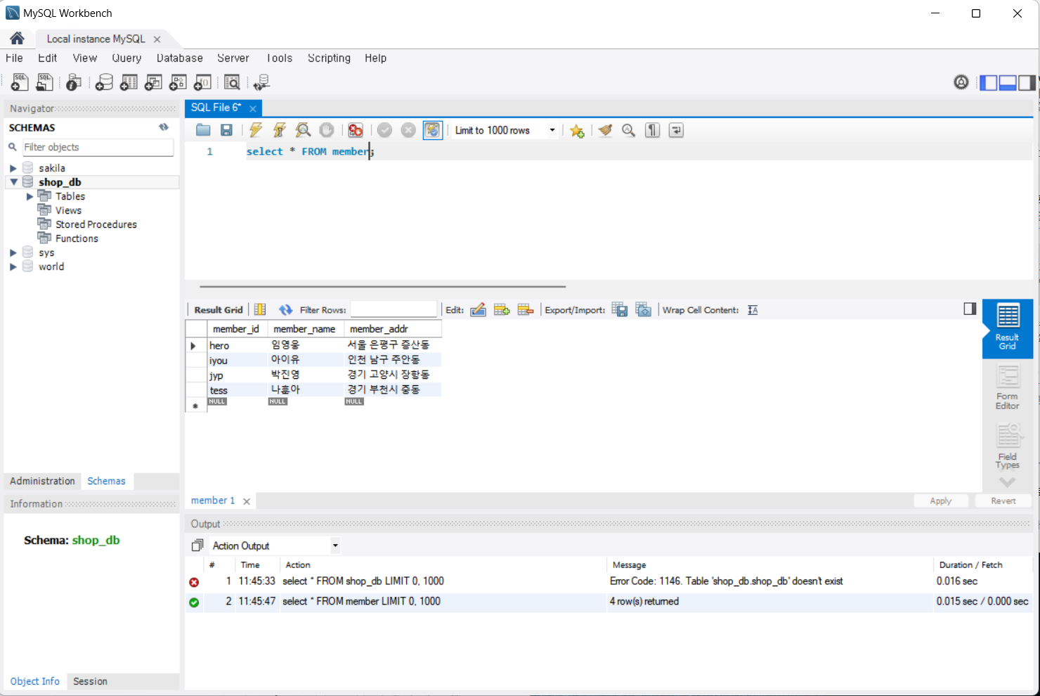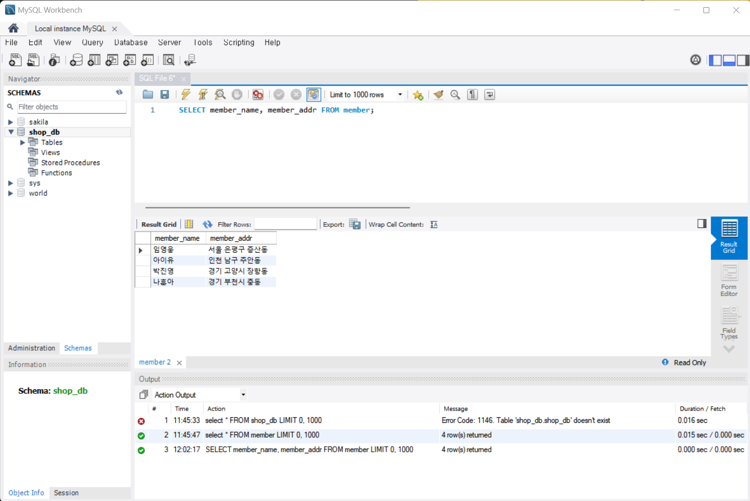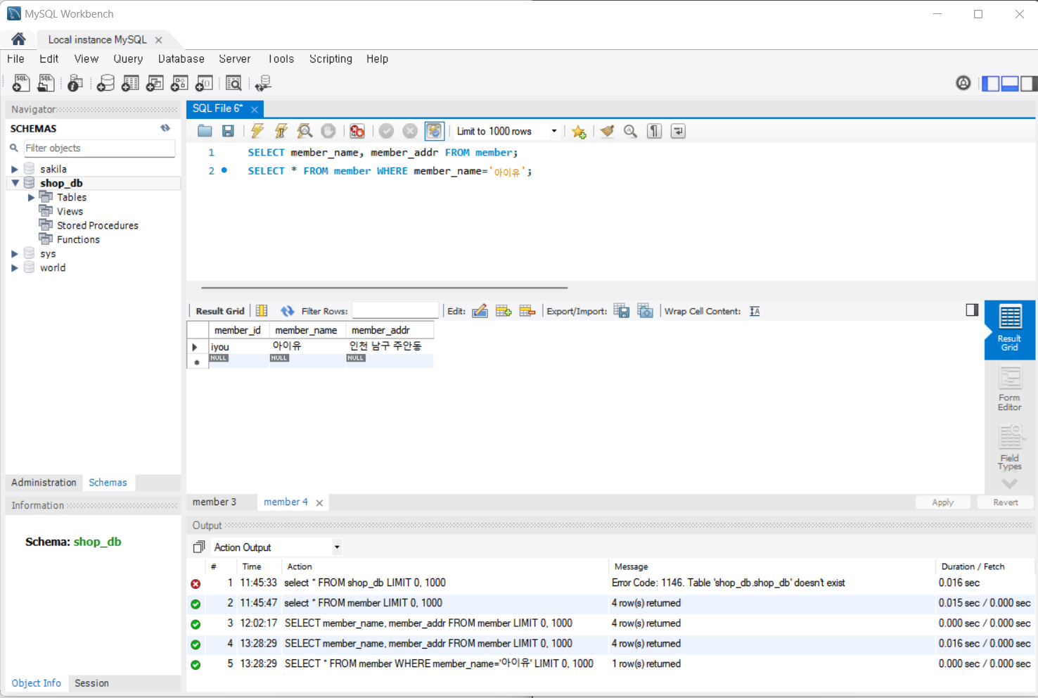4. 회원 테이블 중에 이름과 주소만 출력해보자. 기존 쿼리를 지우고 다음과 같이 새로 입력한 후 실행하자.